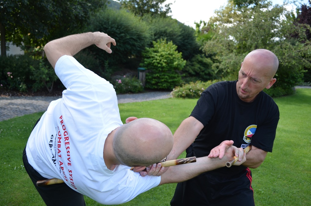 Progressive System Combat Arnis nutzt die eigene dynamische Körpermasse (Körpermechanik) und entwickelt durch den Einsatz des Dreiecks- und Winkelprinzips höchste Effizienz und Flexibilität.